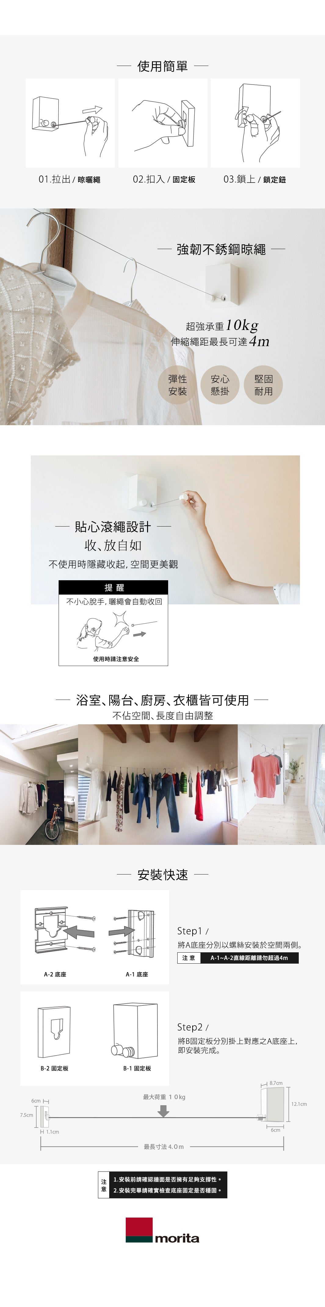 - 超長距4m伸縮晾繩,可彈性安裝